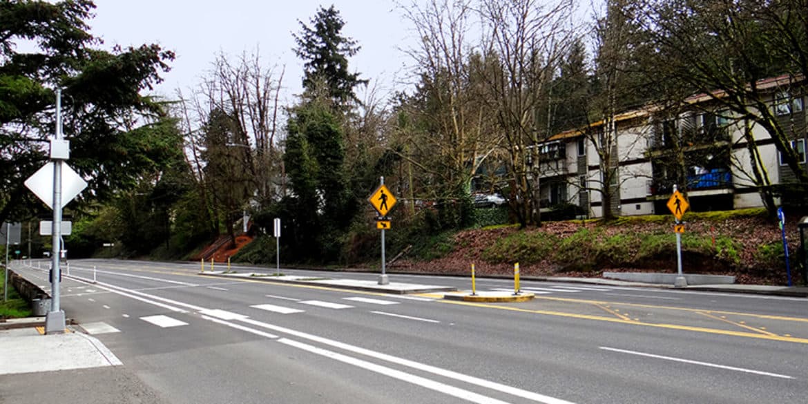 Emerio was the prime consultant for this PBOT roadway design project to provide safety improvements on Beaverton-Hillsdale Highway between SW 30th and 35th Avenues. An identified high crash corridor, this section of highway has a high pedestrian crash rate and high rate of speeding. As part of PBOT's Fixing our Streets program, Emerio was responsible for design of a new marked pedestrian crossing with a median island and Rapid Flashing Beacons at 35th Avenue, a protected pedestrian/bike lane space, reduced travel lane widths, and ADA-compliant pedestrian curb ramps.